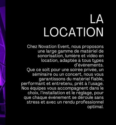 Novation Event propose des prestations techniques, un service DJ sur-mesure et la location de matériel professionnel. Nous accompagnons mariages, entreprises et événements privés en Île-de-France avec expertise et matériel haut de gamme. Son, lumière et DJ.
